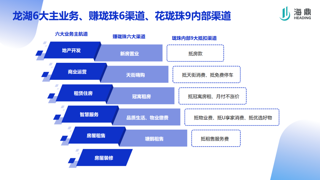 消費者賺取瓏珠,主要是可以通過六種途徑,比如在天街系列項目消費,在龍湖的線上渠道網購或是進行不動產類業態進行購買或租賃等等。那么同樣的,消費者在賺取瓏珠后,就可以使用這些龍珠去抵商場消費、抵房款、抵房租、抵物業費等等,其所謂的瓏珠內部抵扣的9大渠道,都是龍湖6大主業務的關聯渠道。