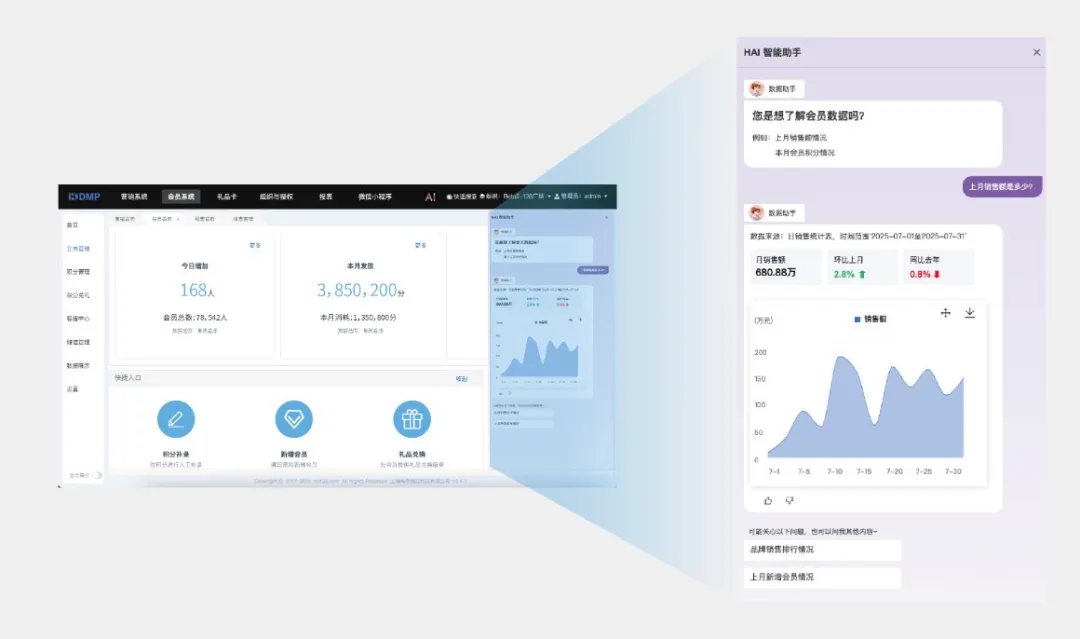 借助AI技術,海鼎科技旗下商管、數字化營銷平臺等產品已初步具備智能分析能力。AI助手能夠基于系統內部數據進行分析,揭示數據背后的規律與趨勢,實現從“發生了什么”到“為什么會發生”再到“未來如何行動”的升級轉變。這一轉變,不僅提升了系統的應用價值,還為企業提升了管理準確性、決策效率,從而幫助商業體建立行業競爭優勢。