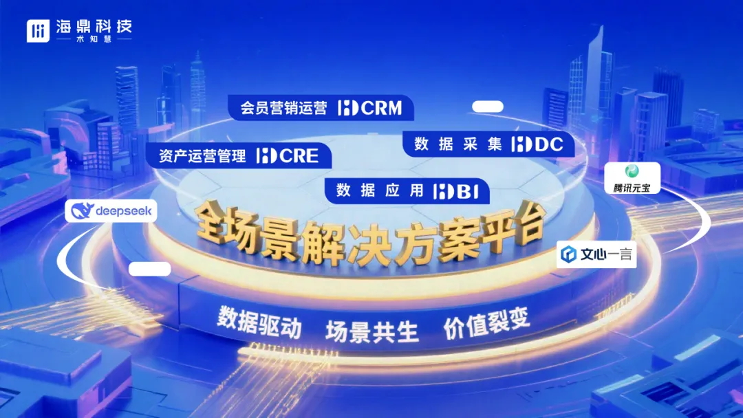 海鼎科技自主研發的數智化全場景解決方案平臺,在整合DeepSeek、騰訊元寶、文心一言等主流AI大模型的同時,結合海鼎科技智慧商業知識體系匹配調整,精準度較通用模型提升30%,為資產運營管理(HDCRE)、會員營銷運營(HDCRM)、數據應用(HDBI)、數據采集(HDDC)等核心產品方案注入“AI智腦”支撐,推動商業地產從傳統空間租賃管理模式向“數據驅動、場景共生、價值裂變”智慧生態進化。